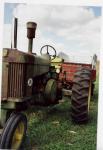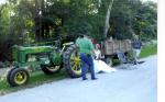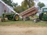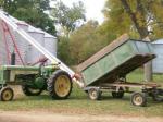 I like this one. Here's how my wagons shake out. First picture: the wagon hooked to the picker is a homemade box on a later JD gear. Can't remember the hoist, probably a Midwest brand (very popular around here). The wagon in the background is a Dultmeier 5 in 1 box on an IH gear, Midwest hoist probably. Second picture is a Weir (now Omaha Standard) box on an early JD gear (with the springs) and a Midwest hoist. Third picture is a wagon we keep for parades and such (wedding in these pics). It's not mine, but is a friends grandpa's. Its a Heider 8x12 foot box on a later JD gear with a JD hoist. The last pic (another wedding pic) is a JD 8x10 foot box on a "middle" JD gear (long hubs, no springs) with a Midwest hoist. I put a new floor, floor stringers, and side stringers on this wagon this summer. Found the tounge and groove for the floor stacked in a hay loft of an old barn. Came out of an old house and was in real good shape. Im the guy closest to the camera in the last one.